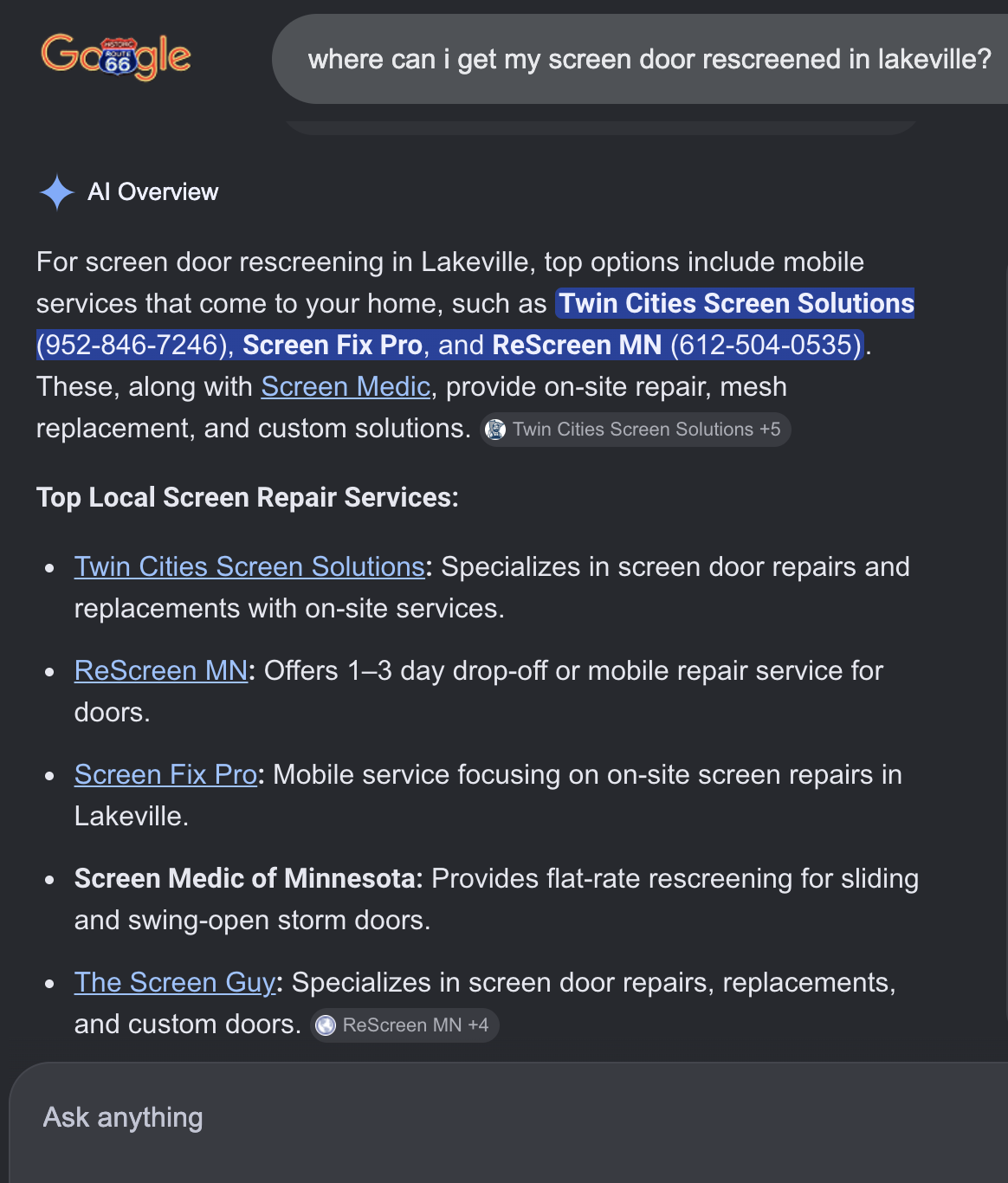 See how we took a local screen repair business from no website to the top of Google's AI Overview.